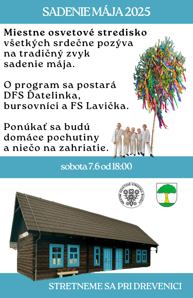 Miestne osvetové stredisko v spolupráci s obecným úradom zorganizovalo sadenie obecného mája, ktoré sa uskutočnilo v sobotu v predvečer Turíc, 7.6.2025 pri Švošovskej drevenici. Počas tejto kultúrno-spoločenskej akcie sa predstavil detský folklórny súbor Ďatelinka a Bursovníci.